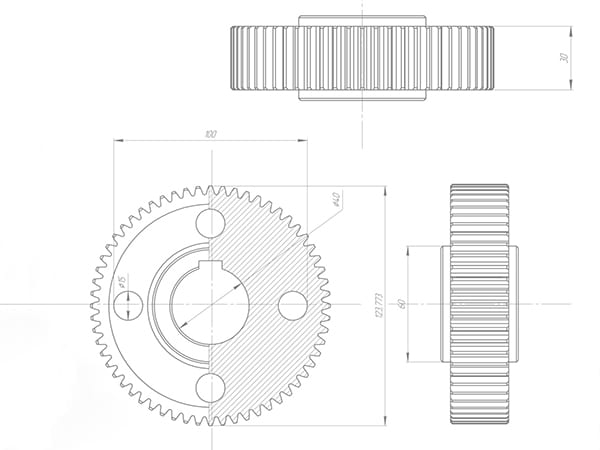 Il disegno tecnico dell’ingranaggio ci permette di progettare un prodotto in linea con le richieste specifiche del cliente, tenendo conto del proporzionamento modulare.